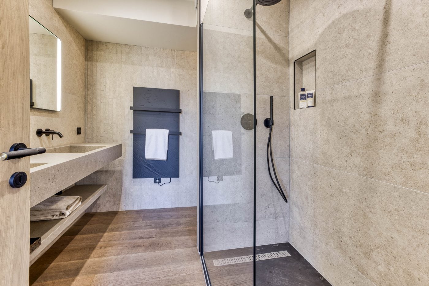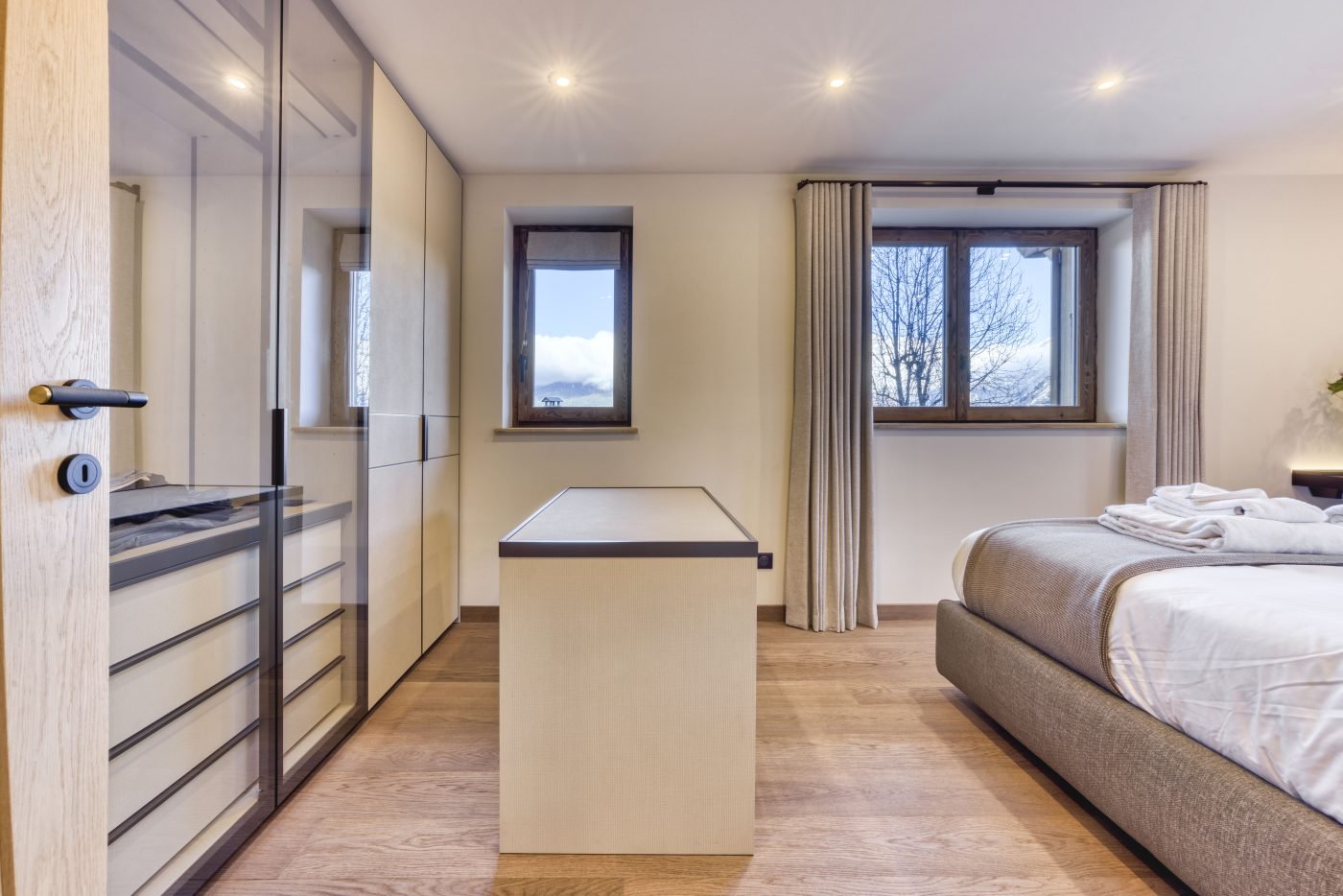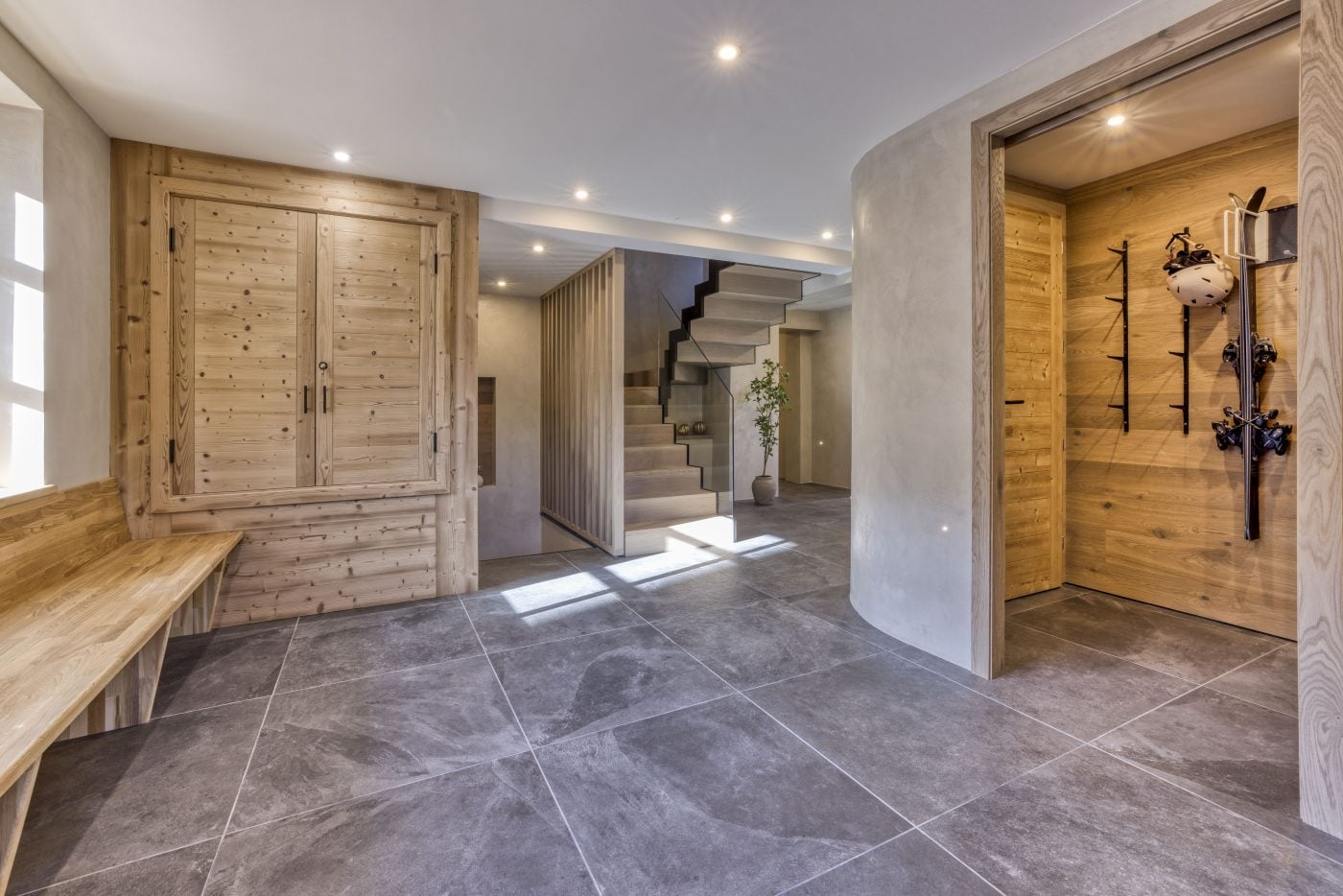Spanning 230 m² across four levels, Chalet Nid d’Hiver comfortably accommodates up to ten guests in five beautifully appointed en-suite bedrooms. The ground floor houses the main entrance, along with a convenient guest WC and a dedicated ski room for easy storage and access to your equipment. This level also features two bedrooms with en-suite bathrooms, one twin/double with en-suite bathroom, providing a perfect balance of comfort and flexibility for families or groups.