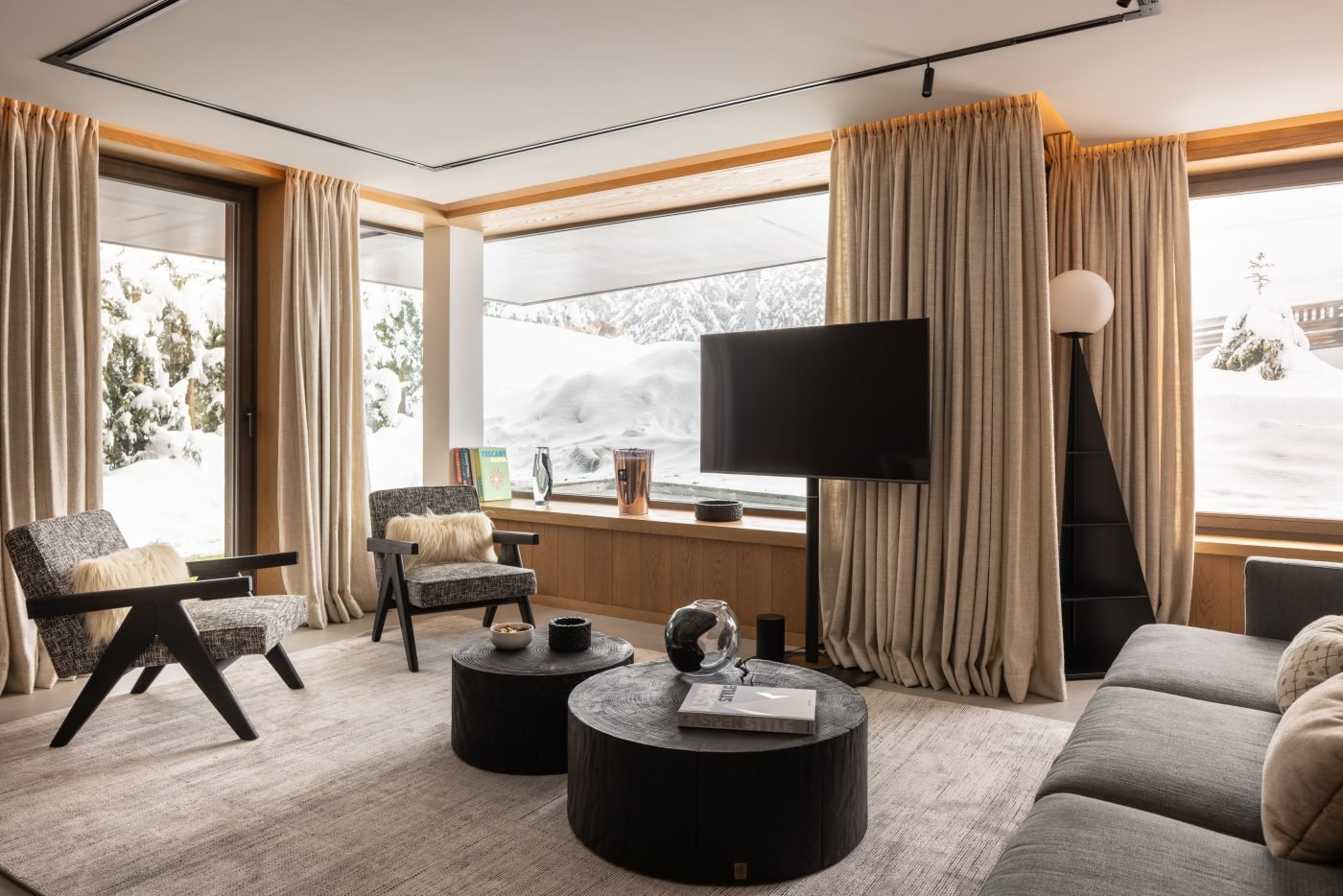 Rich textured fabrics combined with natural wood paneling create a warm and contemporary alpine environment. Sleeping six people in three double bedrooms all with en-suite bathroom or shower rooms, this Courchevel 1850 apartment is perfect for a family or group of friends.
