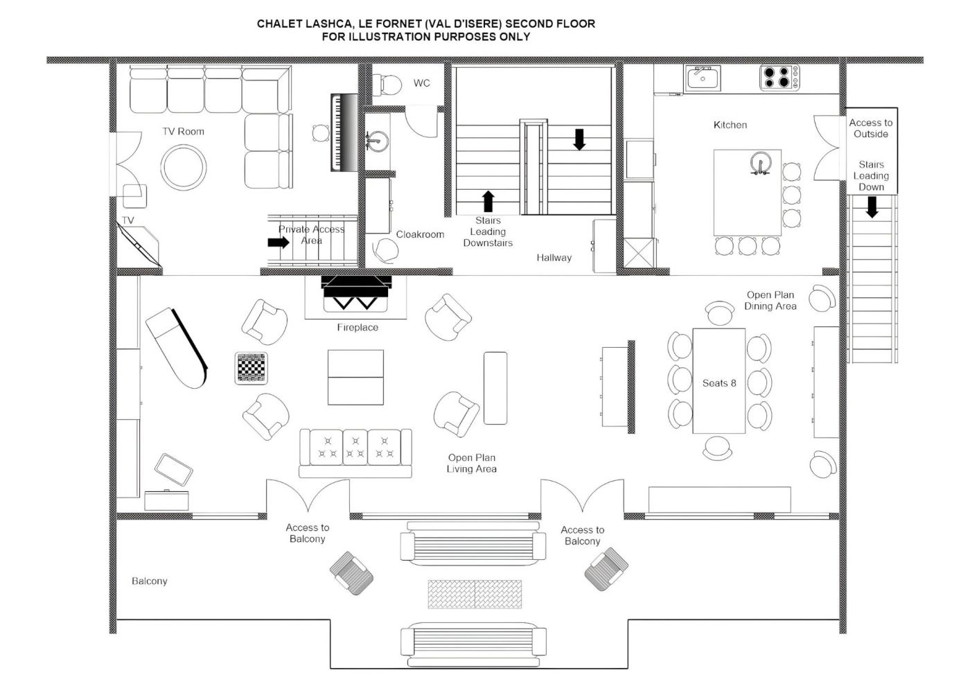Heading up to the main living floor is the wonderful open-plan living and dining area, framed by the huge floor-to-ceiling windows in this space, flooding the space with light, and providing gorgeous mountain views. The kitchen is expertly equipped for all your chef's desires, meaning you can whip up a feast in no time. Just in front of the kitchen is the dining table, seating 8, enjoy your breakfast looking out at breathtaking mountain views. Leading out from this space is the large, spacious balcony, perfect for soaking up that glorious mountain sunshine. The plush, cosy sofas surround the fireplace, perfect for curling up here to relax after a busy day skiing and regaling tales of the day. There is also a useful WC, tucked away in this space. Completing this floor, just next to the living room, is a cosy TV snug, perfect for letting the children do their own thing whilst the adults entertain next door.