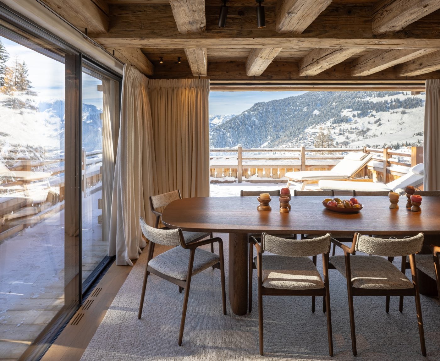 Upon entering the first floor, you are welcomed by an expansive open-plan living area that exudes both elegance and comfort. The living room features a striking curved sofa and sumptuous velvet armchairs, all arranged around a statement wood-burning fireplace. Floor-to-ceiling windows flood the space with natural light and open out onto two spacious terraces, offering the perfect spot to bask in the alpine sun while enjoying uninterrupted views of the surrounding valley.