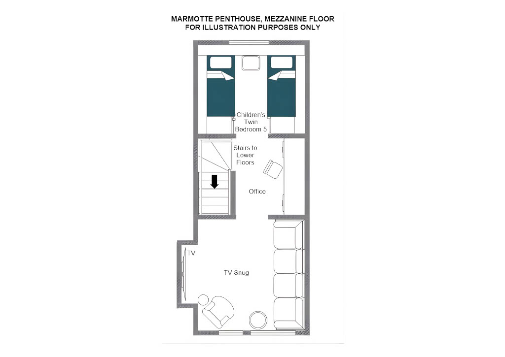 The mezzanine floor houses a well-appointed children's twin bedroom, a cosy TV snug, and a small office.