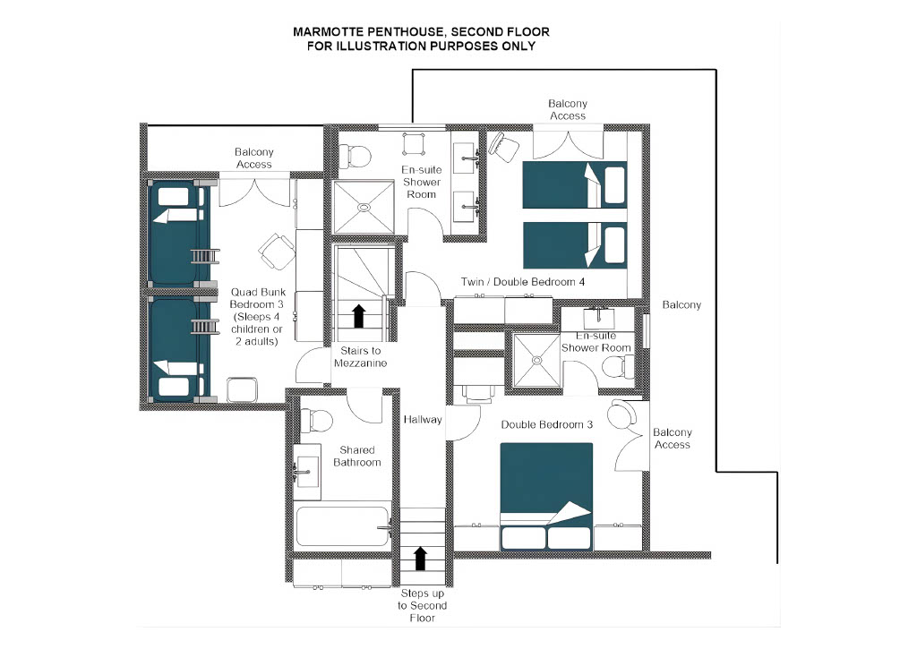 Moving upstairs, discover another beautiful double bedroom with floor-to-ceiling cupboards, an ensuite shower room, and access to a shared balcony. Also on this floor is a shared bathroom. The quad bunk room, sleeping four children or two adults, is complete with a desk and has access to the back balcony. Additionally, a twin room with an ensuite shower room, his and hers sinks, and access to the shared balcony, offers a tranquil retreat.