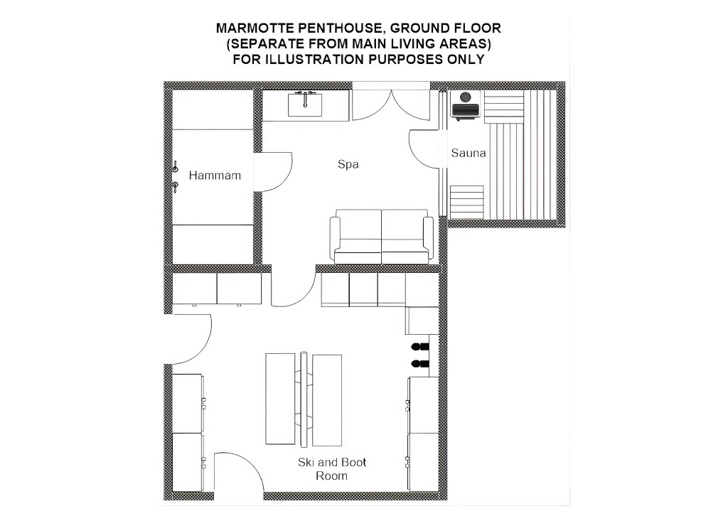 Both the spa and ski room are private, located in the building two floors down from the apartment.
