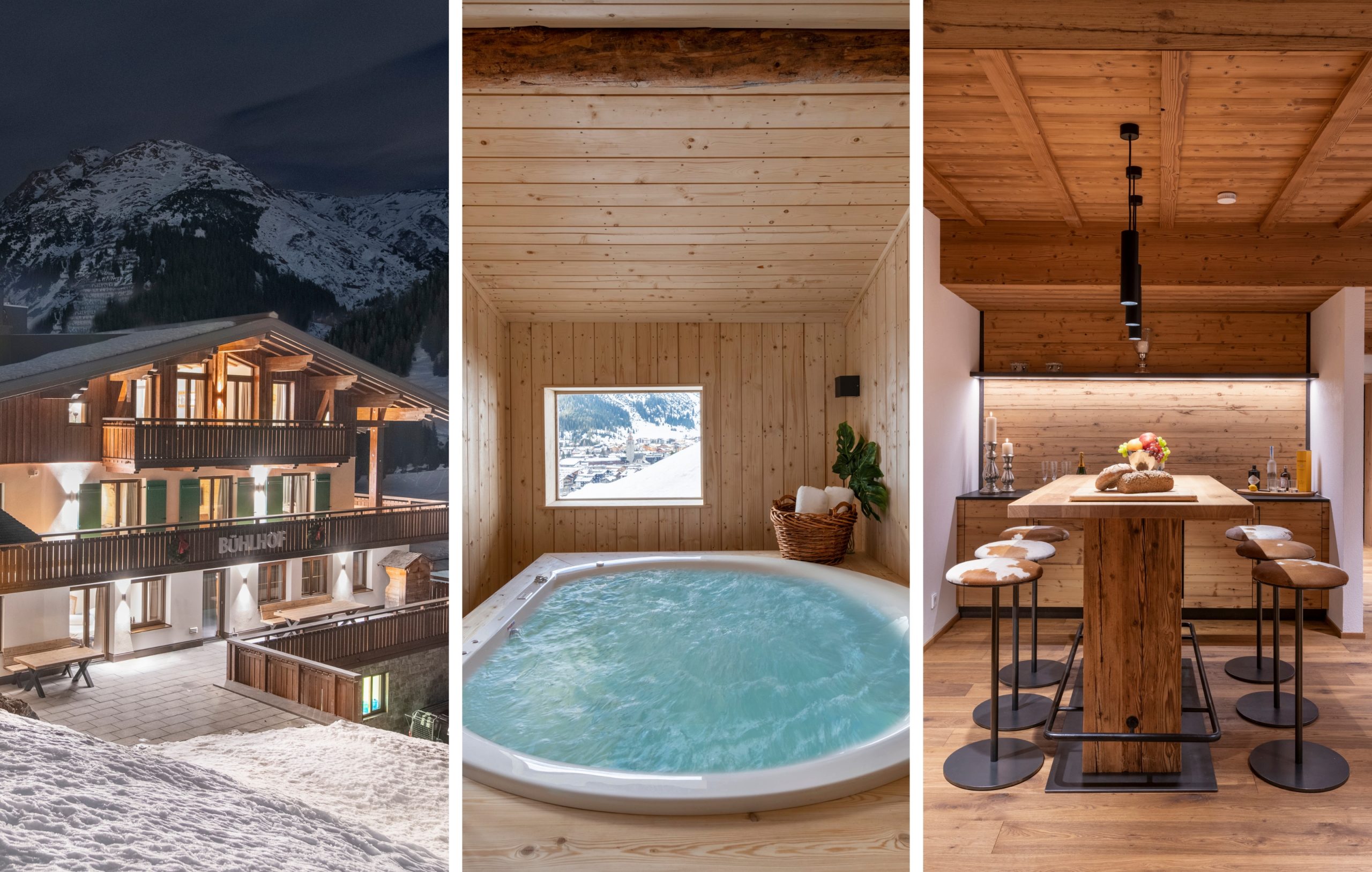 From your ski-in/ski-out perch above Lech, the day unfolds effortlessly: ski from your door in the morning, return in the evening to watch the village lights shimmer below. The penthouse sleeps twelve across six bedrooms, complete with indoor/outdoor hot tub and panoramic mountain views.